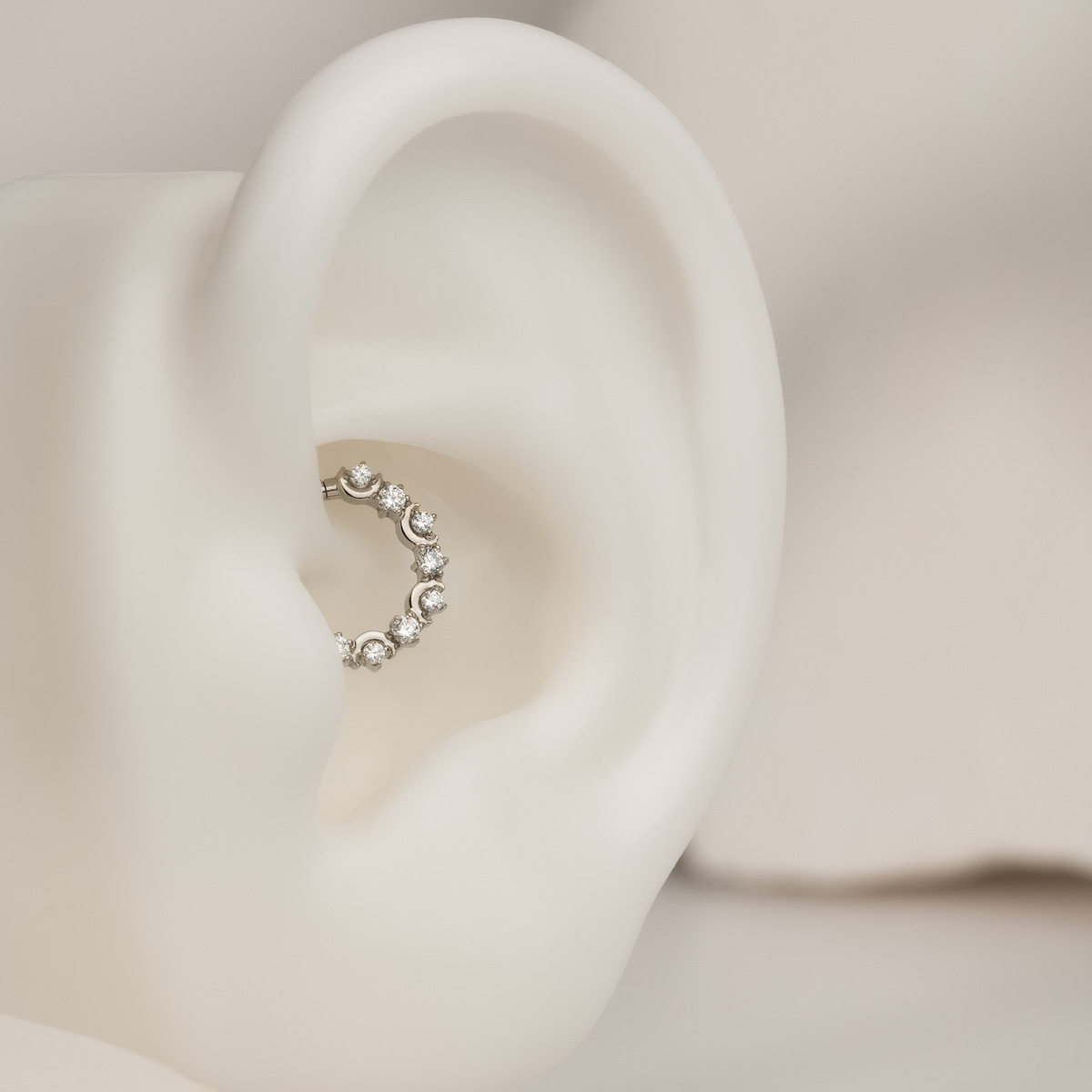 Kolczyk posiada zapięcie typu clicker, które gwarantuje stabilność i wygodę użytkowania. To doskonały wybór do przekłuć septum i daith, gdzie podkreśla kształt przekłucia oraz dodaje elegancji każdej stylizacji.