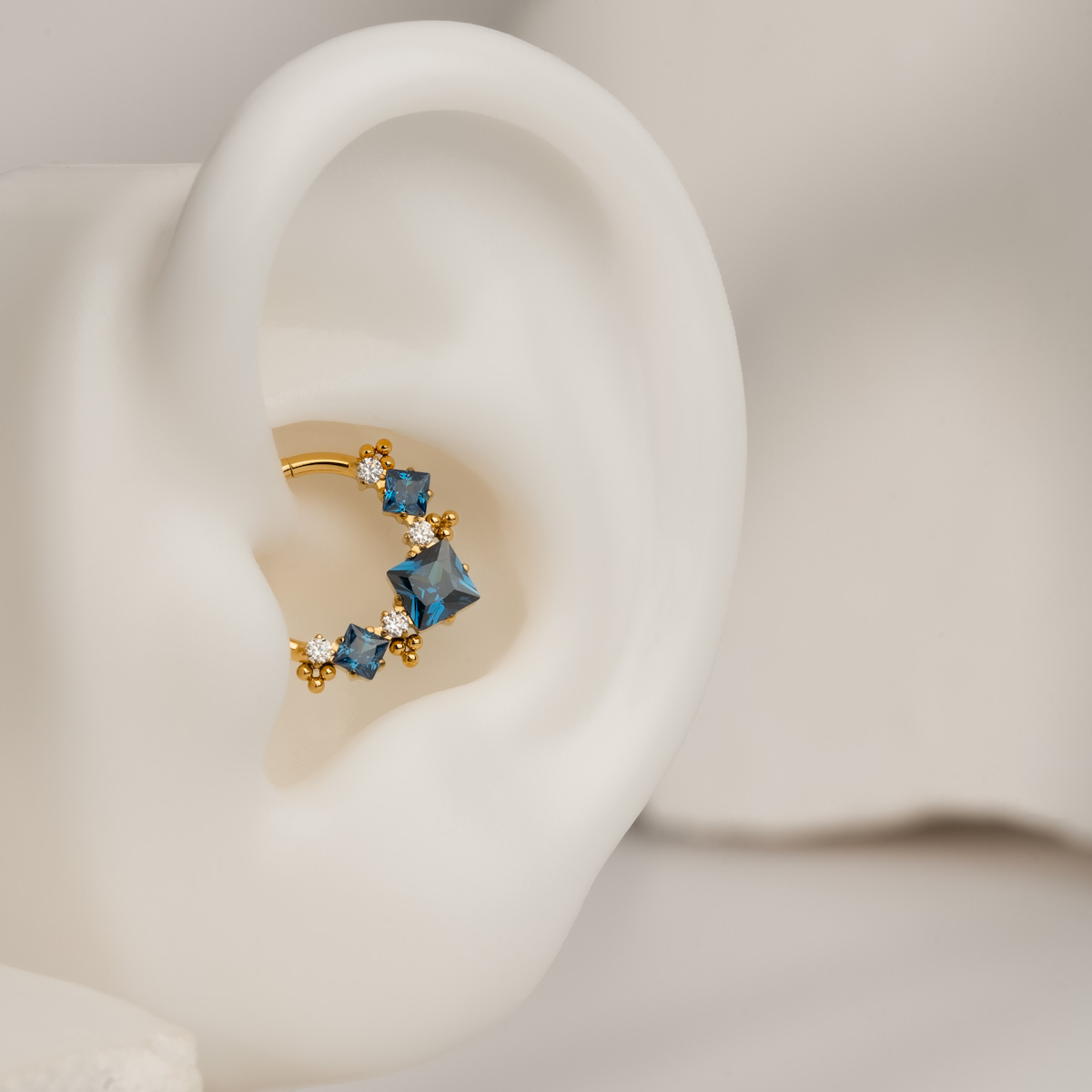 Kolczyk posiada zapięcie typu clicker, które gwarantuje łatwe zakładanie i dopasowanie. Doskonale sprawdzi się w przekłuciach daith oraz septum, dodając im wyrazistego, ale wciąż eleganckiego charakteru.