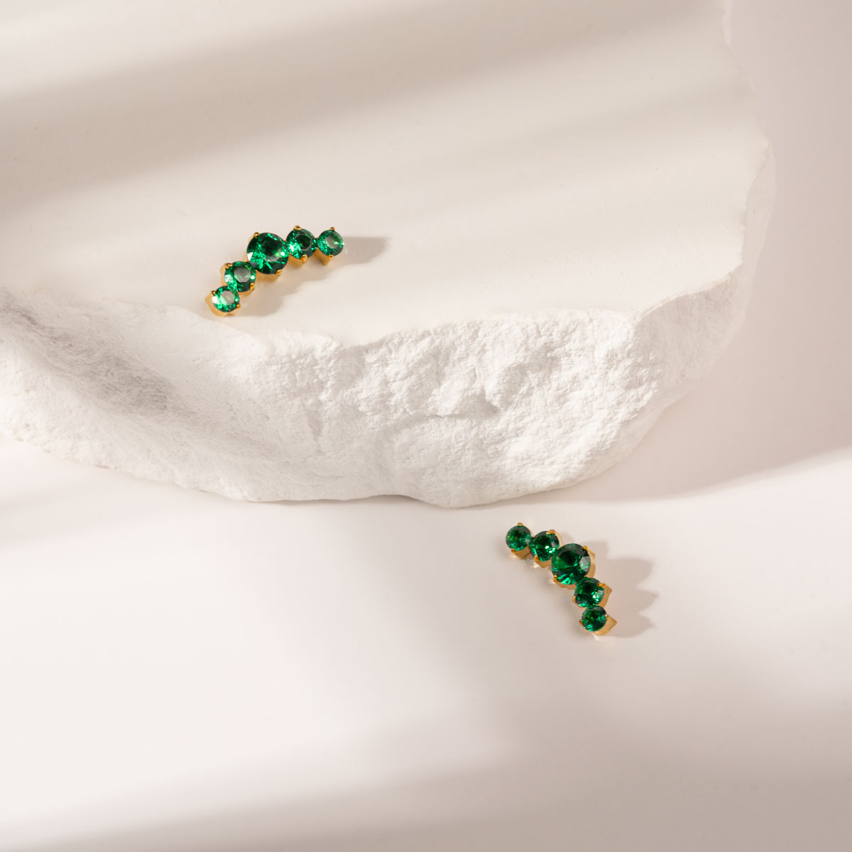 Ten zjawiskowy cluster od Body Blink zachwyca elegancją i głębią koloru. Pięć szmaragdowych cyrkonii klasy 5A, osadzonych w złotej oprawie, tworzy subtelną, falującą kompozycję, która efektownie podkreśla krzywiznę ucha. Nasycony blask kamieni w połączeniu z ciepłym odcieniem złota dodaje całości luksusowego wykończenia.
