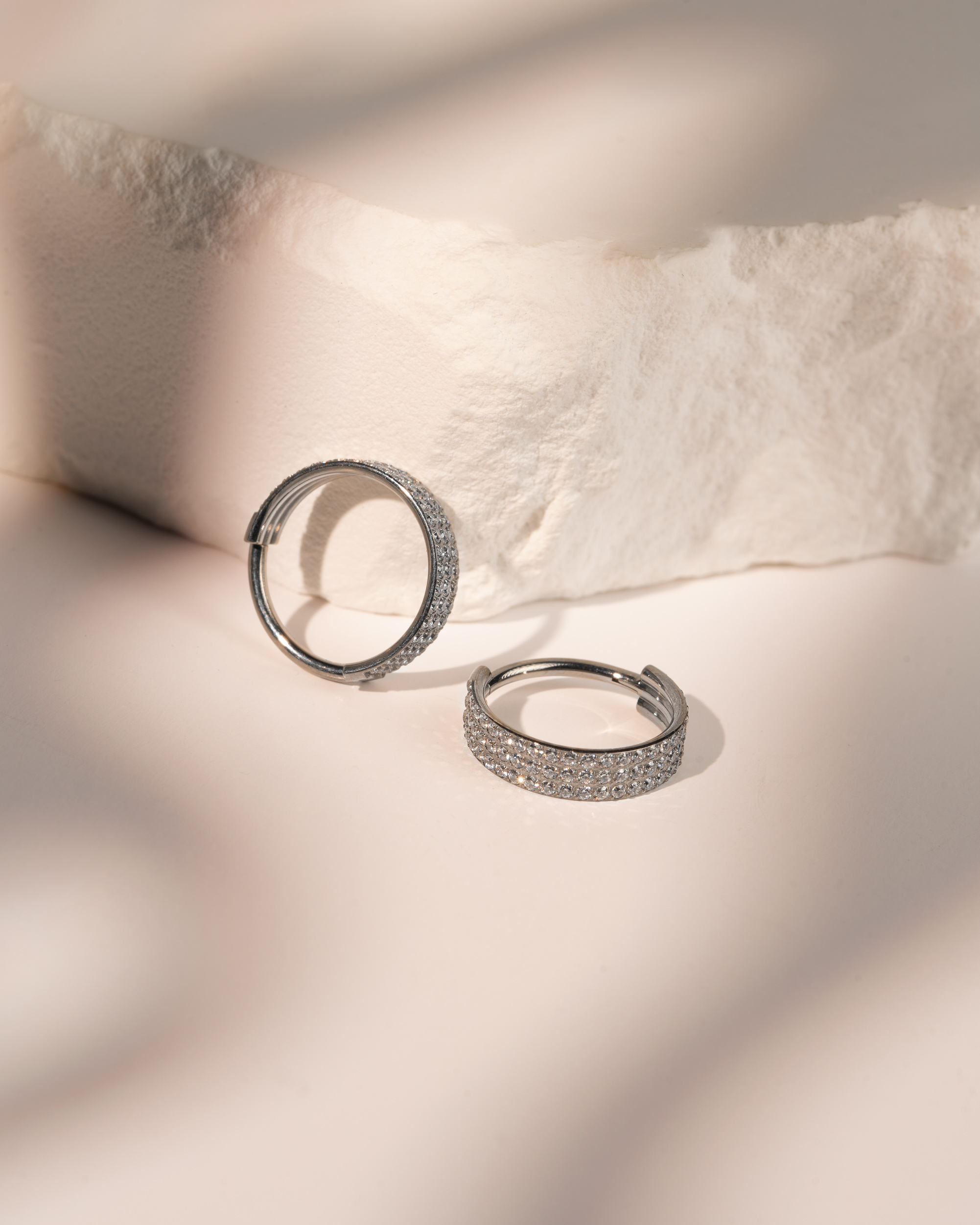 Trzy rzędy starannie osadzonych, błyszczących cyrkonii tworzą nowoczesny, ale stonowany efekt. Clicker łatwo się otwiera i zamyka, dzięki czemu doskonale sprawdzi się w codziennym użytkowaniu. Idealny do piercingu ucha, m.in. helix, conch i lobe.