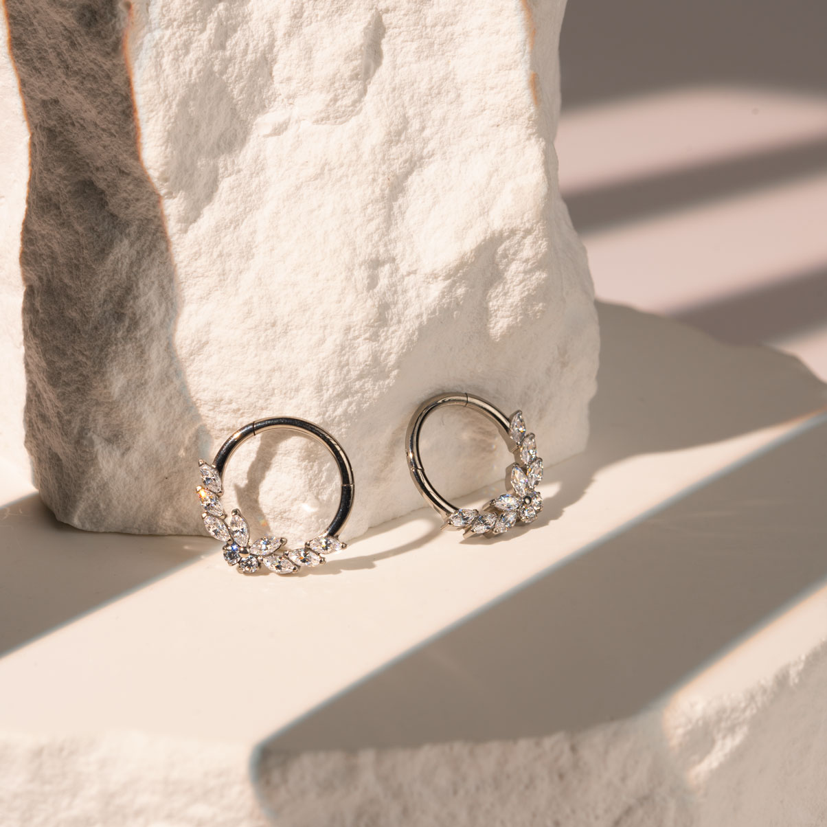 Clicker z motywem liści wykonany z tytanu ASTM F-136  to biżuteria łącząca wyrafinowany design z trwałością. Hipoalergiczny materiał zapewnia bezpieczeństwo dla skóry, a precyzyjne osadzenie kamieni gwarantuje komfort noszenia.