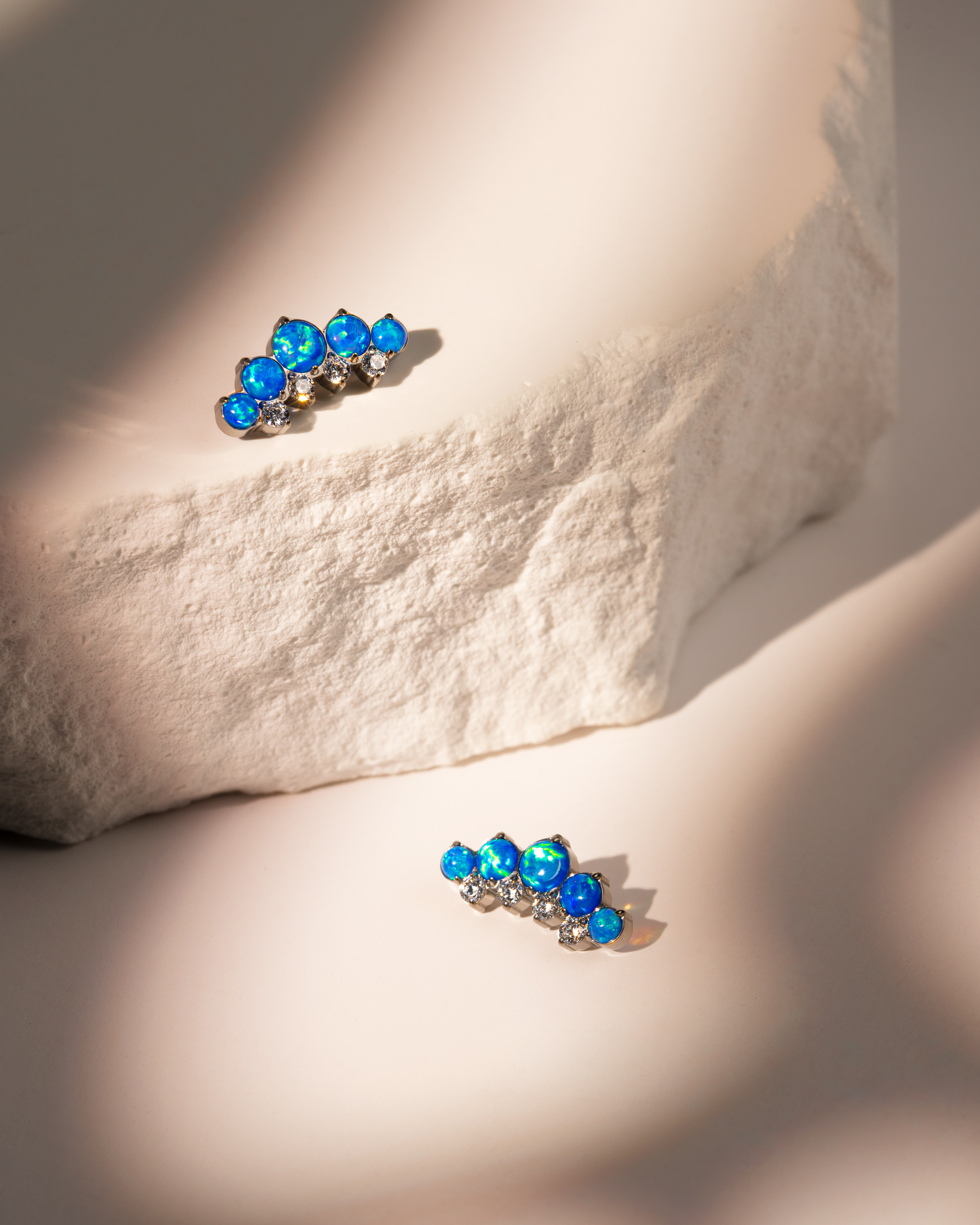 Ozdoba w formie nakrętki typu cluster o wymiarach 12 mm x 5 mm zachwyca zestawieniem pięciu intensywnie niebieskich opali oraz czterech lśniących białych cyrkonii klasy 5A. To harmonijne połączenie kamieni sprawia, że kolczyk z opalem i cyrkoniami przyciąga wzrok i nadaje każdej stylizacji luksusowego charakteru.