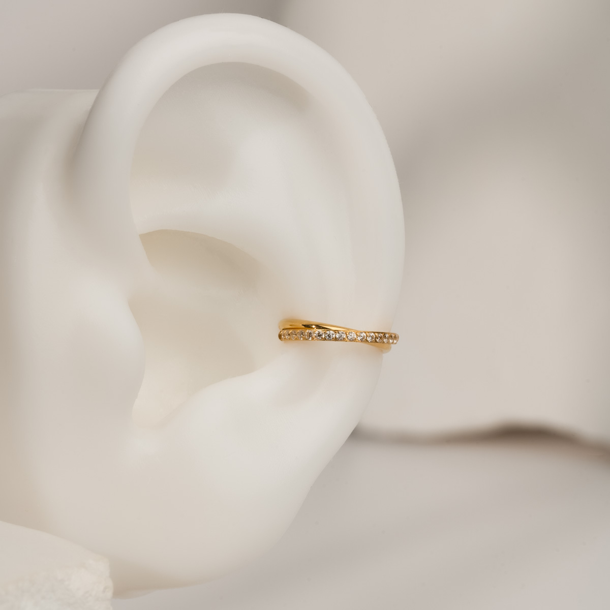 Kolczyk tytanowy złoty clicker z cyrkoniami to uniwersalny model pasujący do piercingu conch helix lub lobe oraz upper lobe. Wykonany z tytanu klasy medycznej ASTM F-136 jest hipoalergiczny, odporny na korozję i bezpieczny nawet dla wrażliwej skóry.