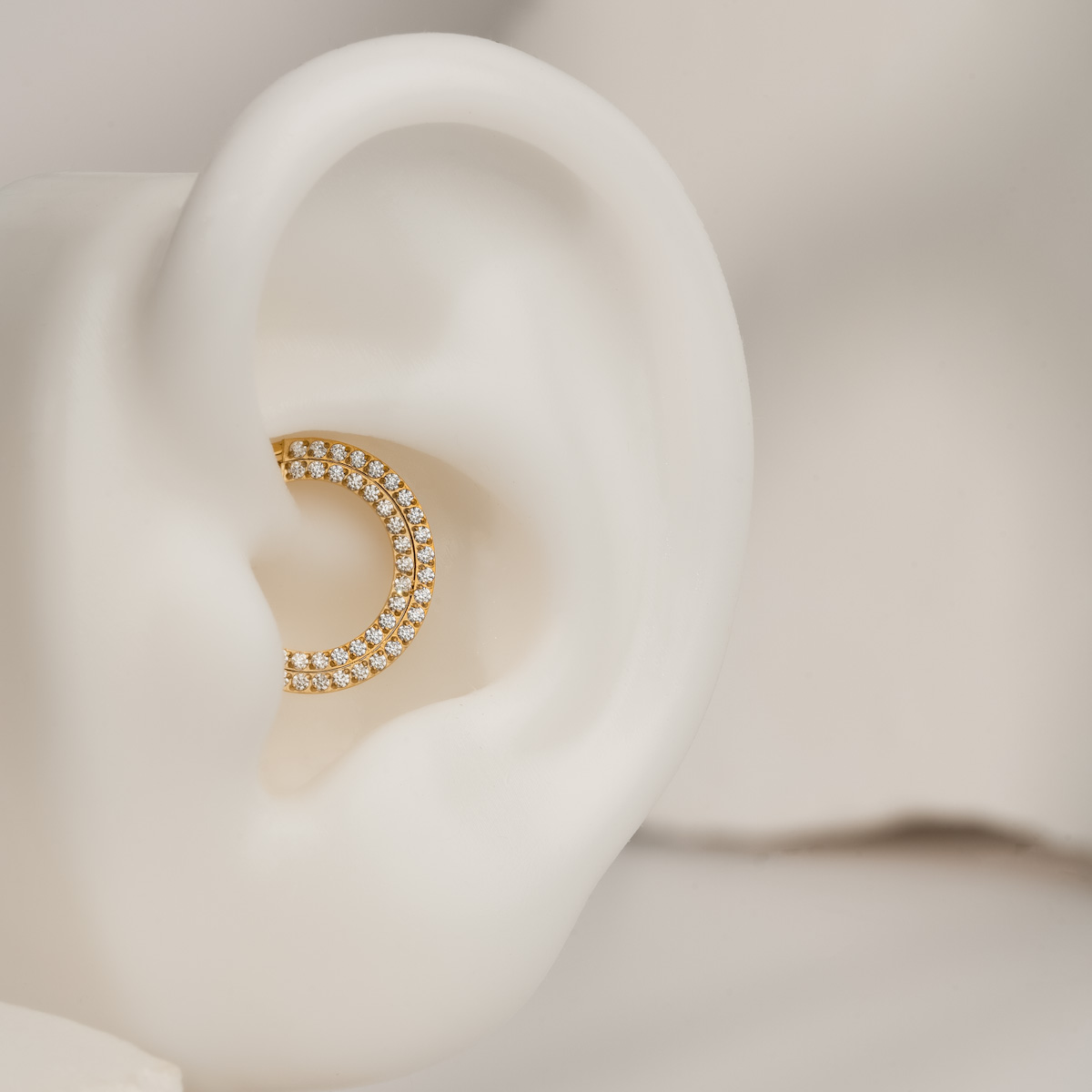 Kolczyk został wykonany z tytanu klasy medycznej ASTM F-136 – materiału, który łączy lekkość, trwałość i właściwości antyalergiczne. Pokrycie powłoką PVD w odcieniu ciepłego złota nie tylko wzmacnia estetykę, ale też zapewnia odporność na zarysowania oraz utratę koloru.