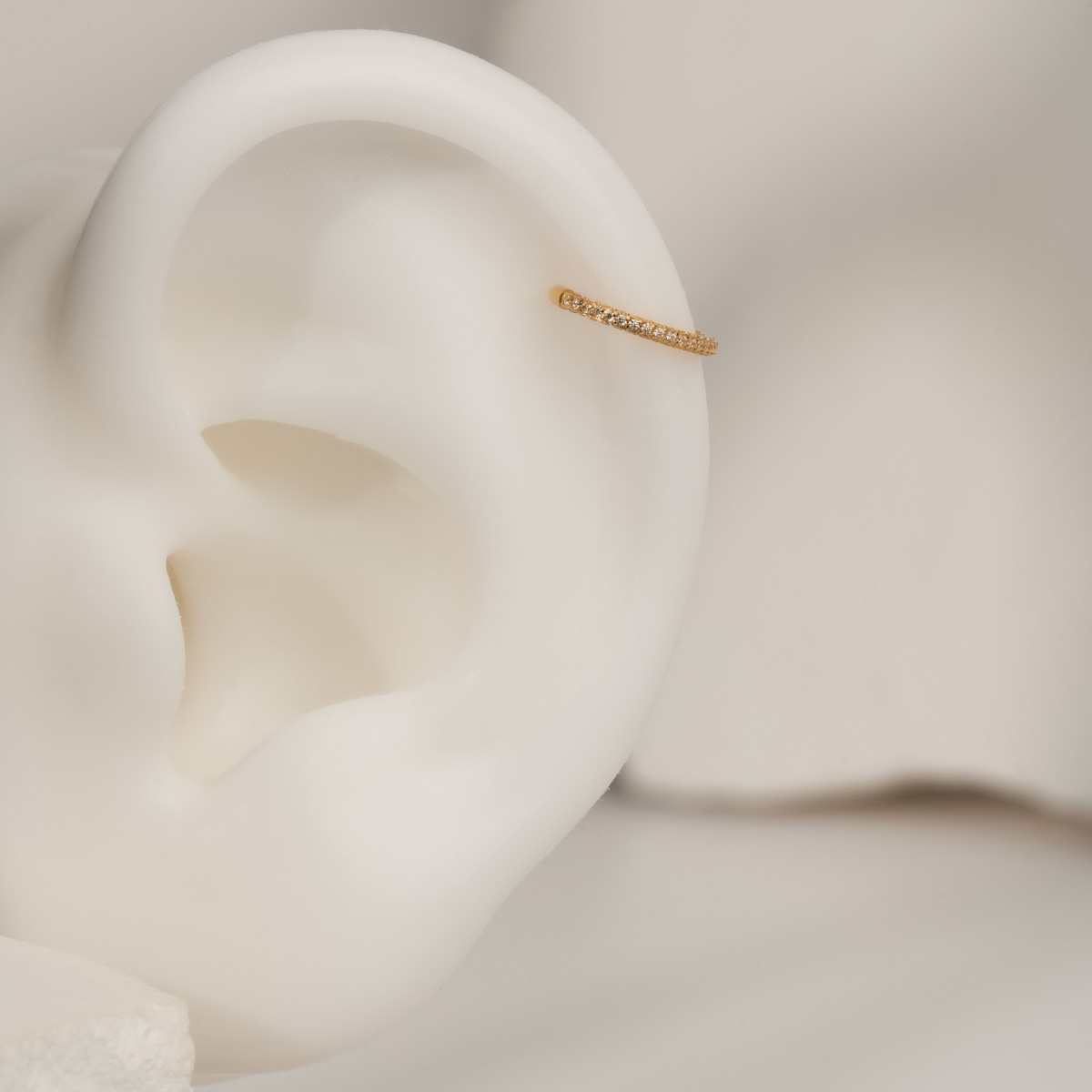 Ten wyjątkowy clicker z tytanu medycznego ASTM F136 to połączenie trwałości, bezpieczeństwa i luksusowego wyglądu. Tytan jest materiałem hipoalergicznym i w pełni bezpiecznym dla skóry, co czyni ten model idealnym do codziennego noszenia. Kolczyk pokryty został trwałą powłoką PVD w złotym odcieniu, która podkreśla elegancki charakter biżuterii i zapewnia wyjątkowy blask. Obręcz zdobią lśniące nano cyrkonie klasy 5A, starannie osadzone na całej powierzchni. To ponadczasowy model, który świetnie sprawdzi się w przekłuciach helix, lobe, upper lobe, tragus, rook lub nostril.