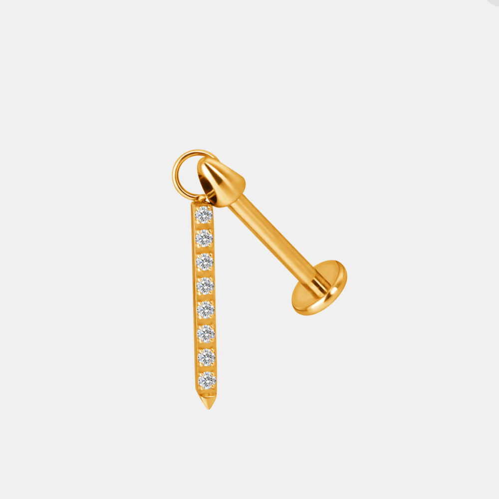 Ten wyjątkowy model kolczyka łączy klasyczną formę labreta z nowoczesnym detalem – smukłą, złotą zawieszką ozdobioną rzędem białych cyrkonii klasy 5A. To biżuteria, która delikatnie porusza się przy każdym ruchu, przyciągając uwagę subtelnym blaskiem.