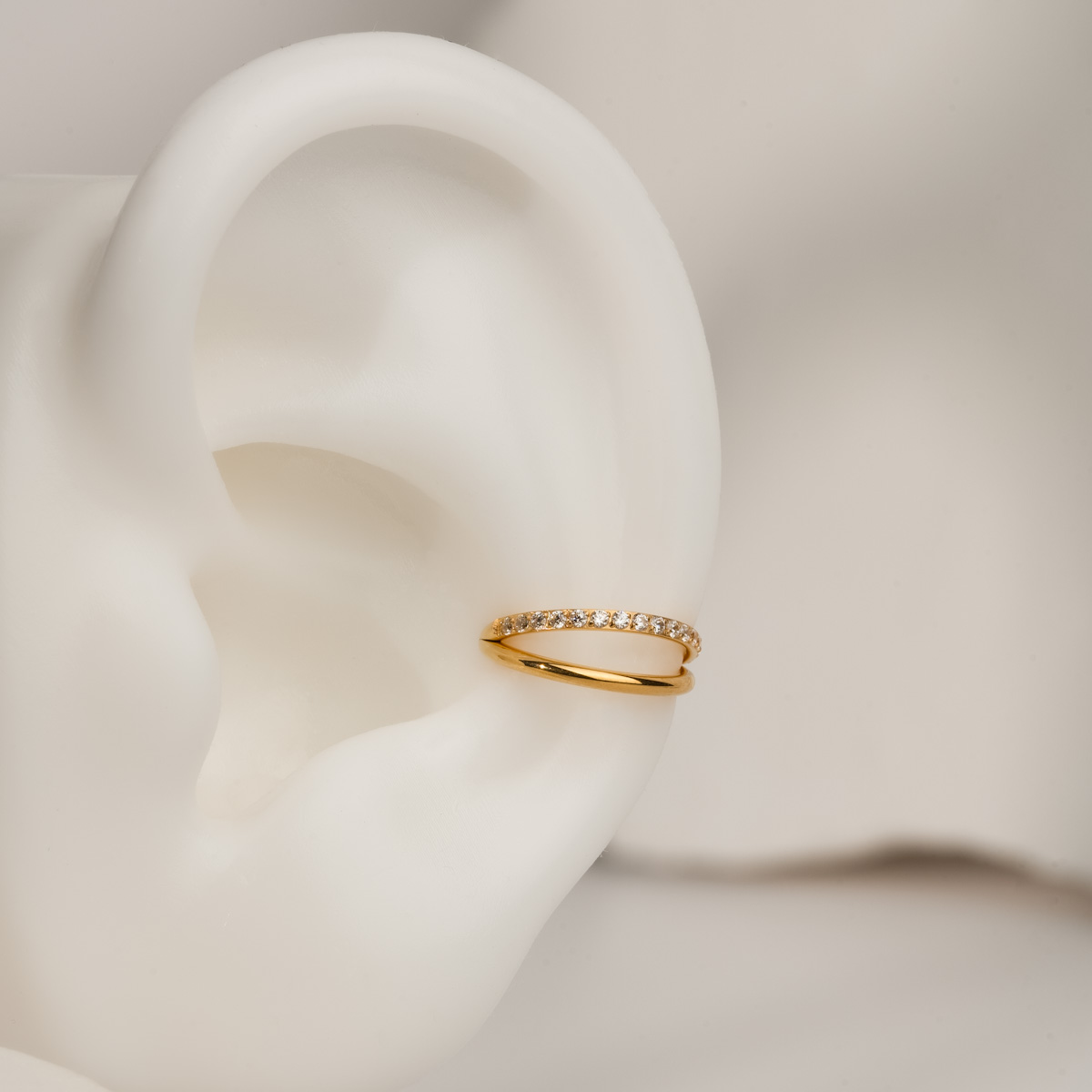 Podwójny clicker wykonany z tytanu ASTM F-136 w złotej powłoce PVD to połączenie trwałości, bezpieczeństwa i stylu. Jedna obręcz jest gładka, a druga zdobiona białymi cyrkoniami klasy 5A, które subtelnie odbijają światło.