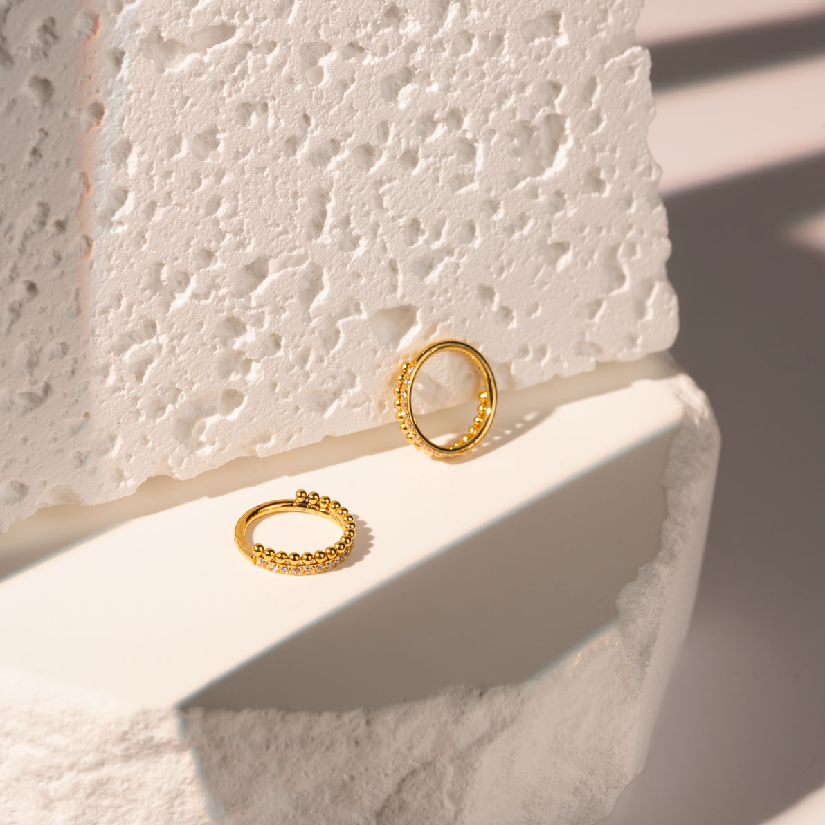 Unikalny wzór łączy linię błyszczących białych cyrkonii z dekoracyjnym rzędem wypukłych, gładkich kulek, co nadaje całości subtelnej elegancji z nutą oryginalności. Kolczyk dobrze leży na uchu i dzięki zatrzaskowemu zapięciu jest wygodny w codziennym użytkowaniu